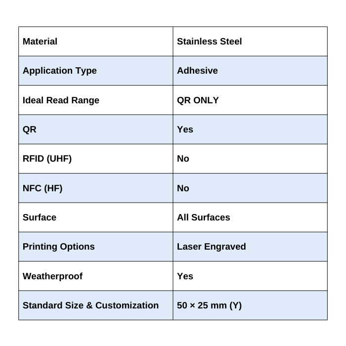 We offer 1mm thick stainless steel QR code labels pre-printed with your information. Available in different sizes.