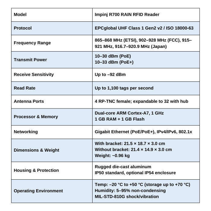 The Impinj R700 reader provides industry-leading performance, enterprise reliability and security, and modern developer tools. IoT developers can easily build and deploy custom enterprise applications with a Linux OS, REST API, and native support for industry-standard data formats and protocols, such as MQTT. The Impinj R700 delivers increased support for on-reader applications – including 10x the processing power. Plus, when combined with tags based on Impinj M700 series tag chips, the Impinj R700 advances RAIN RFID performance at dock doors, conveyors, and store exits.