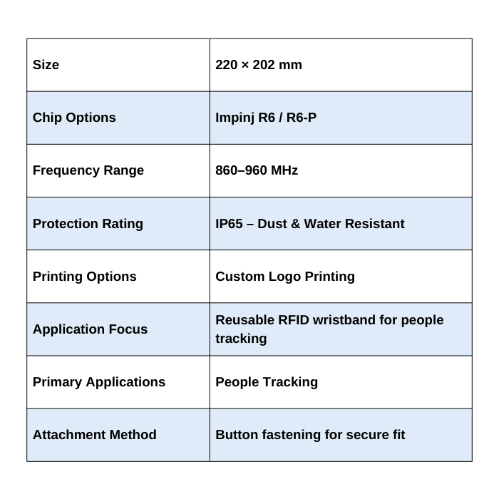 The Wristband RFID tags are designed for efficient people tracking applications. With a size of 220x202mm, these tags provide a comfortable and wearable solution for identification and tracking. They are IP65 rated, ensuring protection against dust and water.